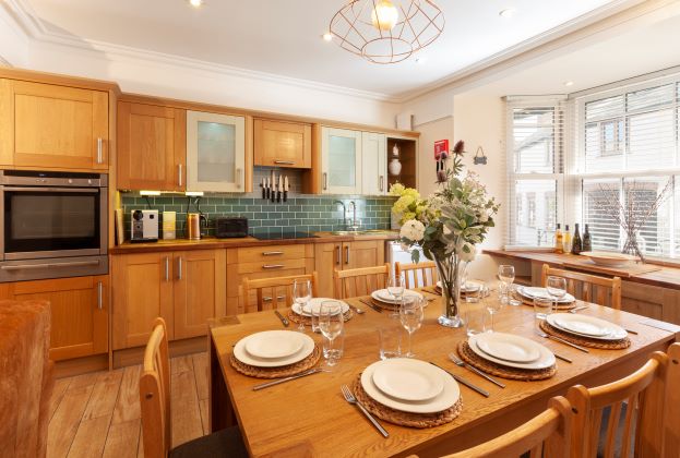 Arranged over three floors the accommodation comprises; entrance porch into the hallway and the stairs lead up to first floor. The ground floor is largely open-plan; the sitting room has a wood-burner with comfortable seating and TV, and French door out to the rear courtyard area. The superb kitchen-dining room is spacious and includes modern appliances such as an integrated induction hob, eye level oven with warming drawer, dishwasher, tall fridge-freezer, kettle and toaster. Ample crockery, cutlery, glassware, pots, pans, and utensils are also provided.